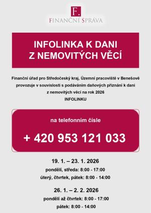 V souvislosti s blížícím se termínem pro podání přiznání k dani z nemovitých věcí na rok 2026 zveřejňuje Finanční úřad pro Středočeský kraj informace týkající se prodloužené úřední doby v lednu a provozu infolinky.